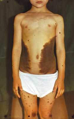 Самыми распространенными пороками развития являются невоцитарные, в обиходе именуемые родинками. Основу их составляют так называемые невусные клетки, возникающие в эмбриогенезе из нервного гребешка и в силу каких-то причин не достигающие зрелости меланоцита. Точные механизмы этой задержки неизвестны, как нет и полного согласия среди специалистов относительно родства невусных клеток и меланоцитов. Тем не менее, в практическом отношении это наиболее значимый порок развития, по крайней мере, по 3 причинам: во-первых, в силу своей распространенности; во-вторых, в силу чрезвычайного разнообразия клинических проявлений – от единичных, малозаметных, небольшого размера пятен до обширных, иногда субтотально покрывающих кожный покров элементов (рис.1), часто с обильным оволосением, представляющих собой не только сложный косметический дефект, но и трудноразрешимую проблему социальной адаптации; в-третьих, в силу вероятности злокачественной трансформации невуса с последующим развитием меланомы, что заставляет врача проявлять постоянную онкологическую настороженность по отношению к этому пороку развития.