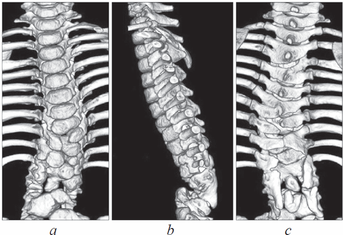 Рис. 1. Предоперационная компьютерная томография: a — множественные дефекты формирования, слияния и сегментации тел позвонков (вид спереди); b — полный поперечный дефект передних структур на уровне условной середины поясничного отдела (вид слева); c — расщепление задних структур нижнегрудного и поясничного отделов (вид сзади)