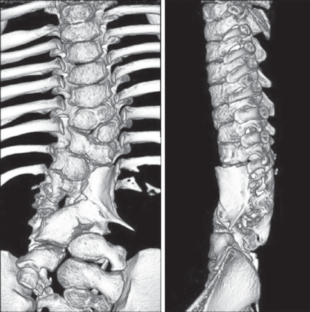 При контрольной компьютерной томографии через 18 месяцев выявлено приживление трансплантата и формирование сплошного костного блока в зоне вмешательства, обеспечивающее стабильность поясничного отдела позвоночника и низкий потенциал прогрессии кифоза (рис. 3). С точки зрения неврологического дефицита отмечено некоторое улучшение с сохранением нижнего парапареза (больше справа; Frankel D). По данным магнитно-резонансной томографии через 25 месяцев после операции признаков компрессии невральных структур не получено. Оперативное лечение, в том числе декомпрессия и/или мобилизация спинного мозга, в настоящее время не показано. Вместе с тем, учитывая возраст ребенка (5 лет) и потенциал роста, необходимы медицинское сопровождение и регулярные контрольные неврологические и лучевые обследования до окончания костного роста.