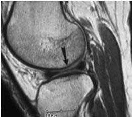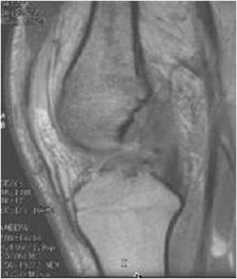 МРТ коленного сустава. Т1-взвешенная сагиттальная МРТ. Разрыв крестообразных связок