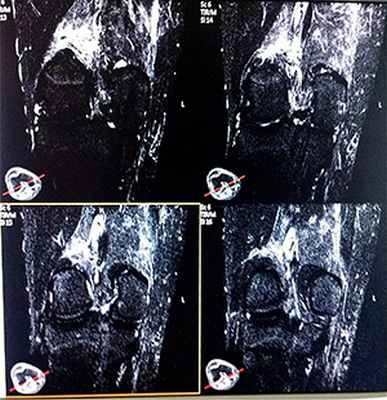 Признаки повышения МР сигнала по Т2 ВИ и в режиме IR, снижения по Т1 от нижней трети /уровень визуализации/ медиальной широкой мышцы бедра. Аналогичные изменения определяются в периартикулярнои клетчатке.