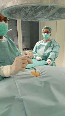 Перед общей анестезией мы дезинфицируем части тела антисептическим раствором. Вы лежите на животе на операционном столе, мы под рентгеновским или КТ-контролем осторожно подводим к пораженному нерву двухмиллиметровую канюлю. Чтобы знать, что мы находимся именно там, где надо, ответственные нервные волокна сначала стимулируются легким раздражающим током (нейростимуляция). При положительных результатах мы вводим стекловолоконный зонд в канюлю, создавая местный нагрев до +80 градусов. Тем самым нервные волокна склерозируются или блокируются. Таким образом, эти нервы более не в состоянии передавать болевой сигнал. Процедура длится около 1 часа.