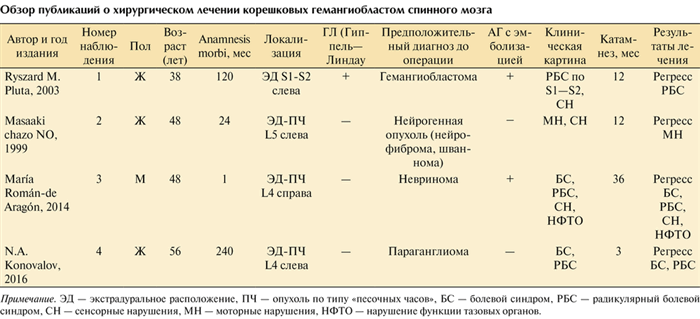 Обзор публикаций о хирургическом лечении корешковых гемангиобластом спинного мозга Примечание. ЭД — экстрадуральное расположение, ПЧ — опухоль по типу «песочных часов», БС — болевой синдром, РБС — радикулярный болевой синдром, СН — сенсорные нарушения, МН — моторные нарушения, НФТО — нарушение функции тазовых органов.