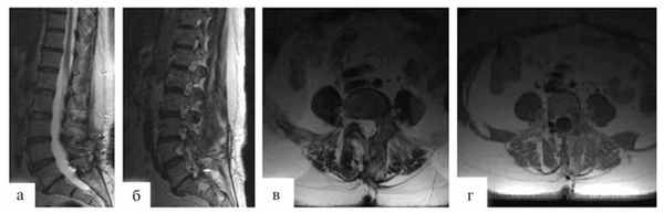 При оценке сведений, представленных в таблице, видно, что были определенные отличия по клинической картине заболевания. Так, в наблюдении № 3 было отмечено острое начало заболевания, когда сильный болевой синдром развился в течение 2 нед, после чего пациентка была госпитализирована в нейрохирургический стационар. В двух других наблюдениях (наблюдения № 1 и 2), так же как и у нашей пациентки (наблюдение № 4), имелся длительный анамнез от 2 до 20 лет. Основными проявлениями опухоли являлась радикулопатия, проявляющаяся болевым синдромом в пояснично-крестцовом отделе позвоночника с иррадиацией в ногу, а также расстройствами чувствительности по корешковому типу. В наблюдении № 3 имелось нарушение функций тазовых органов (недержание мочи), возможно, за счет компрессии корешков «конского хвоста».