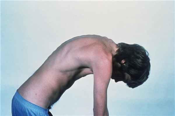 Боли в спине часто развиваются по ночам, могут иметь различную интенсивность и могут рецидивировать. Возникают утренняя скованность, исчезающая после движений, и спазм паравертебральных мышц. Пытаясь облегчить боль и спазм мышц, больные стремятся согнуться, в результате при отсутствии лечения наиболее часто развивается кифоз. Может развиться тяжелый артрит. В поздних стадиях отмечается выраженный кифоз, утрата поясничного лордоза, пациенты постоянно находятся в положении наклона вперед, что нарушает функцию легких и обусловливает неспособность лежать на ровной поверхности. Возможно потенциально деформирующее поражение периферических суставов, иногда пальцев (дактилит). Может развиться тендинит ахилловых сухожилий и надколеника.