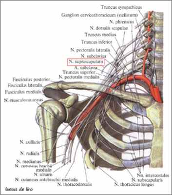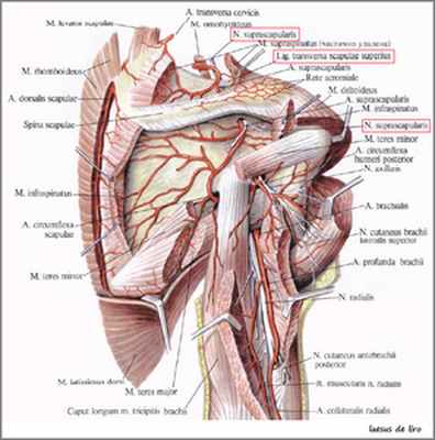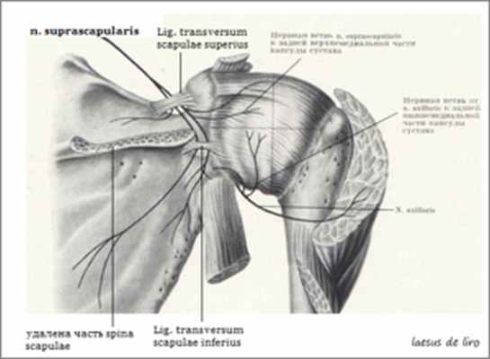 Анатомические данные. Надлопаточный нерв берет свое начало от верхнего ствола первичного пучка плечевого сплетения, формируясь из передних ветвей СV и CVI нервов, идет вниз вдоль наружного края сплетения к верхнему краю лопатки, проходит под верхней поперечной связкой через вырезку лопатки (нередко называемую в литературе «надлопаточной выемкой») в надостную ямку. Ширина этой U-образной вырезки колеблется от 2 см до нескольких мм, что имеет патогенетическое значение для возникновения компрессионной невропатии. В надостной ямке нерв отдает ветви к одноименной мышце и акромиально-ключичному сочленению.
