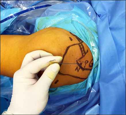 Декомпрессию надлопаточнго нерва в надлопаточной вырезке выполняли через субакромиальный доступ по методике, описанной S. Burkhart и соавт. [16]. Сначала осматривали субакромиальное пространство через задний субакромиальный портал и создавали стандартный латеральный портал. Производили дебридмент поверхности надостной мышцы и нижней поверхности акромиона и выделяли ость лопатки. Пальпацией или иглой идентифицировали акромиально-ключичный сустав, затем позади его создавали модифицированный портал Neviaser.