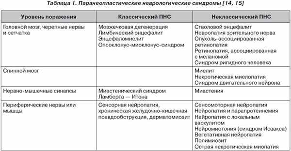 По определению Л.И. Дворецкого, паранеопластический синдром — клинико-лабораторное проявление злокачественной опухоли, обусловленное неспеци–фическими реакциями со стороны различных органов и систем или эктопической продукцией опухолью биологически активных веществ [4]. Согласно последним опубликованным данным [3], ПНС развиваются в 10–18,5 % случаев при мелкоклеточном раке легкого, яичников и молочной железы, толстой кишки, злокачественных лимфомах у лиц среднего и пожилого возраста. Наиболее часто используется классификация ПНС по системному признаку: эндокринные, нейромышечные или мышечно-скелетные, сердечно-сосудистые, дерматологические, гематологические, гастроэнтерологические, нефрологические, неспецифические, смешанные. Неврологические ПС включают поражения центральной и периферической нервной системы, нарушения нейромышечной передачи, вовлечение в процесс скелетных мышц [12, 16, 26]. Новые исследования в нейроонкологии привели к выделению классических и неклассических паранеопластических неврологических поражений (табл. 1).
