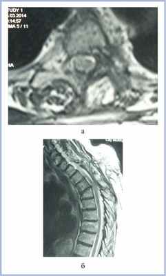 Рис. 4. МР-томограммы (Т2-ВИ) пациентки с менингиомой на уровне Th3—Th4 позвонков в аксиальной (а) и сагиттальной (б) проекциях через 5 мес после операции. Определяется небольшая ликворная киста без компрессии спинного мозга.