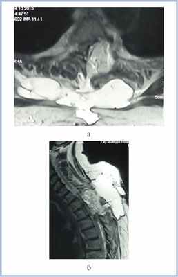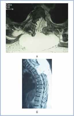 Рис. 3. МР-томограммы (Т2-ВИ) пациентки с менингиомой на уровне Th3—Th4 позвонков перед 3-й операцией в аксиальной (а) и сагиттальной (б) проекциях. Определяется компрессия спинного мозга жировым лоскутом и псевдоменингоцеле больших размеров.