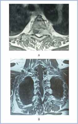Рис. 1. МР-томограммы (Т1-ВИ с контрастным усилением) пациентки с менингиомой на уровне Th3—Th4 позвонков перед операцией в аксиальной (а) и фронтальной (б) проекциях. Определяется объемное образование (менингиома) на уровне Th3—Th4 позвонков, распространяющееся в межпозвонковое отверстие.