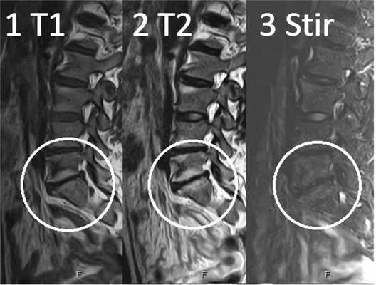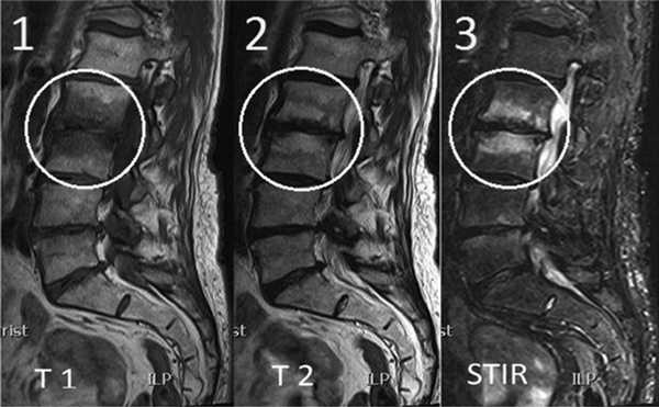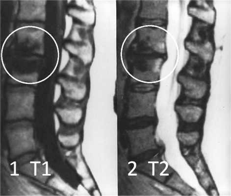 К жировой ткани наиболее чувствительны Т1-взвешенные МРТ. Они являются основой протокола МРТ. В дополнение используются Т2-взвешенные МРТ с подавлением сигнала от жира. Ниже мы остановимся на основных патологиях, проявляющихся на МРТ позвоночника, как патология костного мозга, в первую очередь.