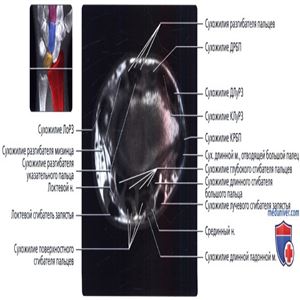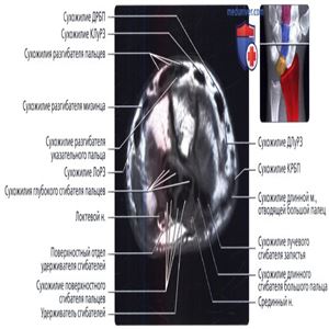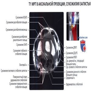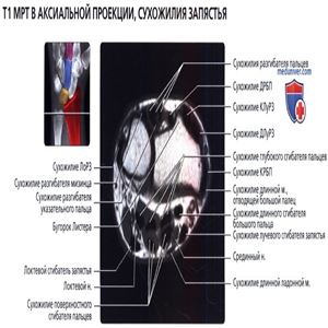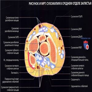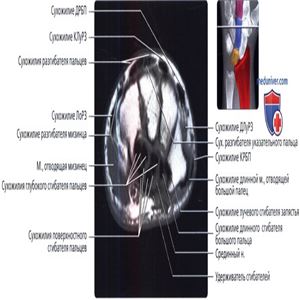 На рисунке в аксиальной проекции показаны сухожилия в запястном канале. Сухожилия глубокого сгибателя пальцев направляются к мизинцу, безымянному, среднему и указательному пальцам параллельно друг другу (от медиальной стороны к латеральной). Из сухожилий поверхностного сгибателя пальцев два глубоких сухожилия направляются к среднему и безымянному пальцам и два поверхностных сухожилия проходят к мизинцу и указательному пальцам. Сухожилие длинного разгибателя большого пальца проходит над сухожилием короткого лучевого разгибателя запястья (КЛуРЗ).