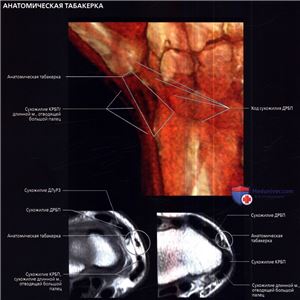 При трехмерной КТ реконструкции с наложением мягких тканей показаны границы анатомической табакерки: длинный разгибатель большого пальца (III канал), пересекает запястье с медиальной стороны к латеральной над сухожилиями короткого и длинного лучевых разгибателей запястья (II канал), образуя заднюю границу, тогда как сухожилия длинной мышцы, отводящей большой палец и короткого разгибателя большого пальца (I канал) образуют переднюю границу. Через анатомическую табакерку проходят лучевой нерв и его поверхностная ветвь, а также одноименные артерия и вена. На МР-томограмме анатомическая табакерка показана в аксиальной проекции.