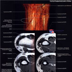 При трехмерной КТ-реконструкции с наложением мягких тканей показан мышечно-сухожильный перекрест короткого разгибателя большого пальца и длинной мышцы, отводящей большой палец, с сухожилиями длинного и короткого лучевых разгибателей запястья, продолжающийся в дистально-латеральном направлении непосредственно проксимальнее удерживателя разгибателей. На аксиальных МР-томограммах их сложное взаимное расположение показано на поперечном срезе. На нижней правой МР-томограмме показан дистальный отдел предплечья: короткий разгибатель большого пальца и длинная мышца, отводящая большой палец, лежат кнаружи и немного кзади от сухожилий короткого и длинного лучевых разгибателей запястья. На нижней левой и верхней правой МРТ короткий разгибатель большого пальца и длинная мышца, отводящая большой палец, пересекают сверху длинный и короткий лучевые разгибатели запястья и располагаются на латеральной поверхности лучевой кости. На верхней левой МР-томограмме—наиболее дистальном из этих срезов, на уровне бугорка Листера, перекрест заканчивается, и сухожилия занимают свое положение на запястье.