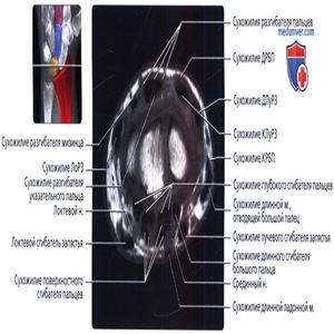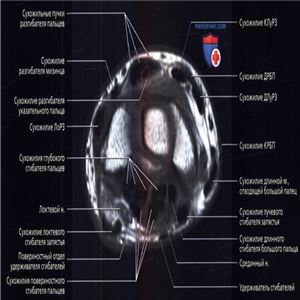 На рисунке в аксиальной проекции показаны сухожилия в проксимальном отделе запястья. Сухожилия мышц-разгибателей проходят под удерживателем разгибателей, а сухожилия сгибателей на этом уровне запястья расположены проксимальнее удерживателя сгибателей.