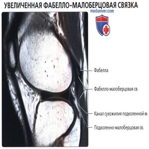 Задняя фронтальная МР-томограмма, полученная в режиме Т1: увеличенная фабелло-малоберцовая связка, идущая от фабеллы к месту своего прикрепления на шиловидном отростке малоберцовой кости.