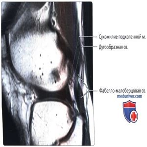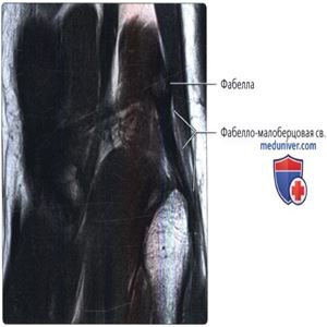 Продольная МР-томограмма, взвешенная по протонной плотности: фабелла с рельефной фабелло-малоберцовой связкой. Размеры фабелло-малоберцовой и дугообразной связок должны быть обратно пропорциональны. При отсутствии фабеллы (и, поэтому, фабелло-малоберцовой связки) хорошо визуализируется дугообразная связка. У этого пациента определяется увеличенная фабелло-малоберцовая связка, а дугообразная связка не видна.