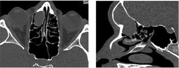Как правило, клиническими проявлениями мукоцеле являются головные и лицевые боли, появление припухлости у внутреннего угла глазницы со смещением глазного яблока кнаружи (при мукоцеле лобно-решетчатой локализации) или кверху (при поражении верхнечелюстной пазухи). При эндоскопическом исследовании можно выявить выпячивание латеральной стенки носа в сторону перегородки. Одним из информативных методов диагностики мукоцеле является спиральная компьютерная томография (СКТ) пазух с реконструкцией изображения в трех плоскостях [6—8]. Это позволяет выявить ряд изолированных поражений мелких пневматизированных полостей: мукоцеле буллы носовой раковины [9, 10], а также клеток Галлера [11], Оноди [12] и валика носа [13]. Методом выбора при лечении этой патологии является эндоскопическая ринохирургия [14].