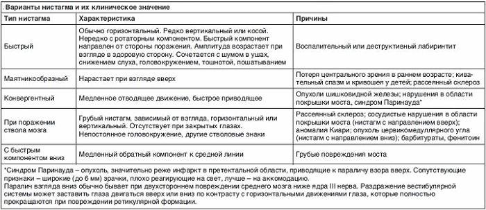 - Смешанный нистагм — фазы движения зависят от направления взгляда: вперед — маятникообразный, в сторону — толчкообразный.
