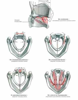 — голосовая мышца (m. vocalis) - помимо расслабления голосовых связок, принимает участие в суживании голосовой щели и располагается в толще голосовых связок, начинаясь от внутренней поверхности щитовидного хряща и прикрепляясь к голосовому отростку и черпаловидному хрящу;