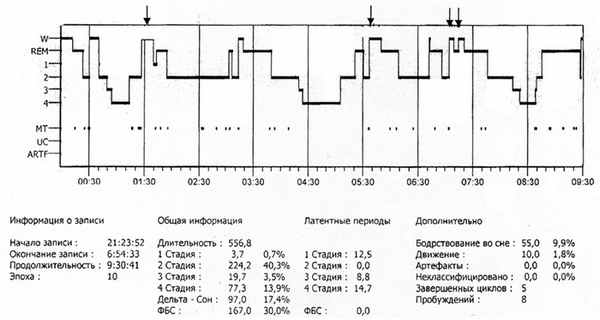 Гипнограмма пациента Б. Во всех случаях ночной сон начинался с фазы быстрого сна. Увеличено время бодрствования внутри сна. Во время сна пациент от двух до четырех раз вставал для приема пищи (отмечено стрелками) и каждый раз последующий сон начинался с фазы быстрого сна. Редуцирована представленность 2-й стадии медленного сна. δ-сон сохранен и представлен в основном 4-й стадией. Увеличена представленность фазы быстрого сна, причем эта тенденция возрастала с течением заболевания. Увеличена двигательная активность во сне. Кроме того, в ЭЭГ ночного сна были выявлены следующие феномены: 1. «Сонные веретена» большой амплитуды — свыше 100 мкв; 2. Во 2-й стадии и δ-сне комплексы «пик—медленная волна» (как единичные так и объединенные в когорты) амплитудой свыше 400 мкв без отчетливой латерализации; 3. В 3-й стадии гиперсинхронный заостренный α-ритм; 4. Во 2-й стадии, δ-сне, фазе быстрого сна отмечаются пароксизмы θ-ритма, наиболее представленные в центральных отведениях, длительностью 1—2 с.