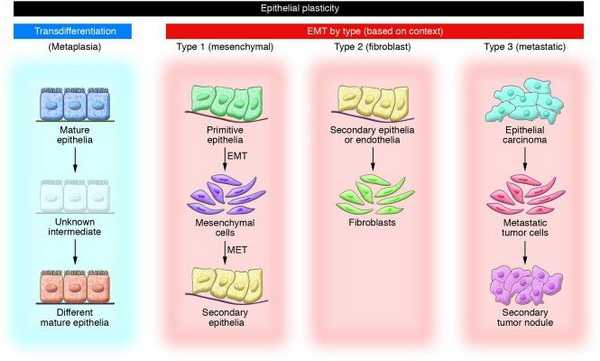 - ЭМТ как часть метастатического процесса при опухолевой прогрессии, когда эпителиальные клетки покидают первичный очаг, мигрируют и реконструируются во вторичную ткань.
