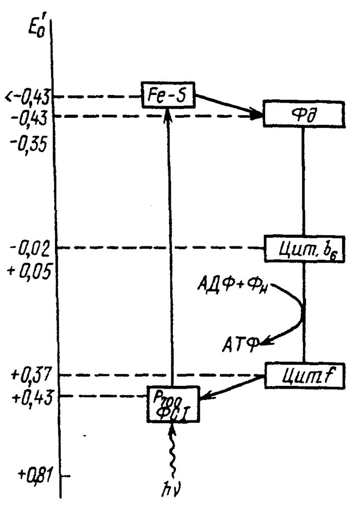 При поглощении кванта света один их электронов пигмента РЦ (P700) переходит на более высокий энергетический уровень. В этом состоянии он захватывается белком, содержащим Fe и S (Fe-S-центр), а затем передается на Fe-содержащий белок ферридоксин. Дальнейший путь электрона - поэтапный, его транспорт обратно к P700 через ряд промежуточных переносчиков, среди которых имеются флавопротеиды и цитохромы. По мере транспорта электрона его энергия высвобождается и используется на присоединение Фн к АДФ с образованием АТФ.
