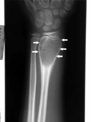 Рентгенологическая картина при хондромиксоидной фиброме типична: опухоль располагается эксцентрично в концевых участках длинных костей, для нее характерны четко отграниченные литические изменения. Проксимальный отдел большеберцовой кости и крыло подвздошной кости являются типичными локализациями.