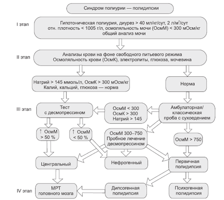Проводится между тремя основными состояниями, сопровождающимися гипотонической полиурией: центральный НД, нефрогенный НД и первичная полидипсия. Дифференциальная диагностика базируется на 3 основных этапах [2].