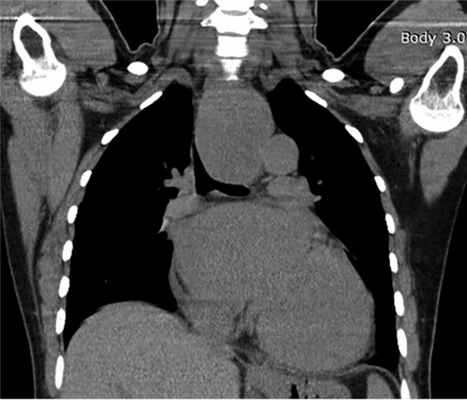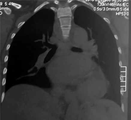 «Золотым стандартом» в диагностике данной патологии является КТ органов грудной клетки, которая играет особую роль для выбора хирургического доступа и тактики хирургического лечения. В описанном примере срединная стернотомия была предпочтительной, учитывая одномоментную коррекцию клапанных пороков сердца.