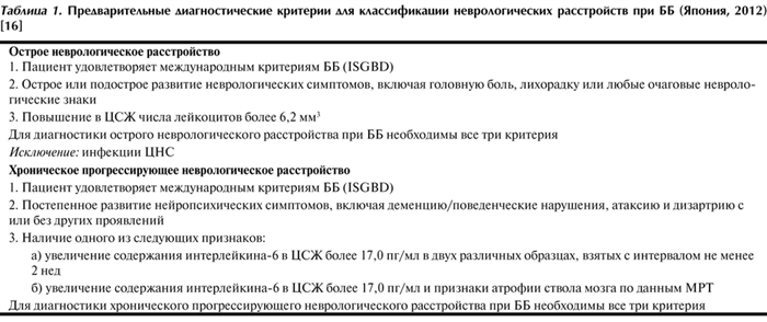 Таблица 1. Предварительные диагностические критерии для классификации неврологических расстройств при ББ (Япония, 2012) [16]