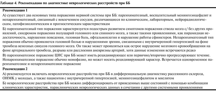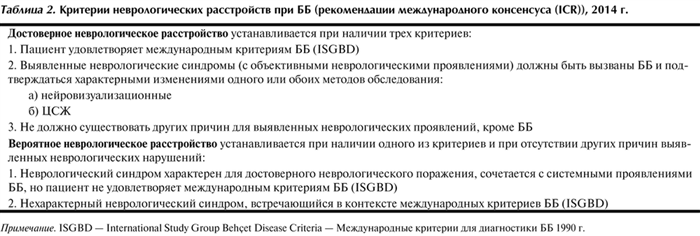 Таблица 2. Критерии неврологических расстройств при ББ (рекомендации международного консенсуса (ICR)), 2014 г. Примечание. ISGBD — International Study Group Behҫet Disease Criteria — Международные критерии для диагностики ББ 1990 г.