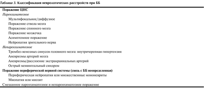 Специфично для ББ паренхиматозное поражение ствола мозга, характеризующееся множественными очагами некроза в белом и сером веществе головного мозга, чаще всего в стволе, базальных ганглиях и внутренней капсуле, с исходом в атрофию мозга и такими клиническими симптомами, как офтальмопарез, нейропатия черепных нервов, дисфункция мозжечка и пирамидная недостаточность. Часто встречается мультифокальное/диффузное паренхиматозное поражение ствола, полушарий головного и спинного мозга, проявляющееся множественными неврологическими симптомами, в частности головной болью, гемипарезом, судорогами, дисфазией, нарушением работы сфинктеров. По данным некоторых авторов [4], паренхиматозное поражение ЦНС наблюдается примерно у 80% пациентов ББ с неврологическими расстройствами.