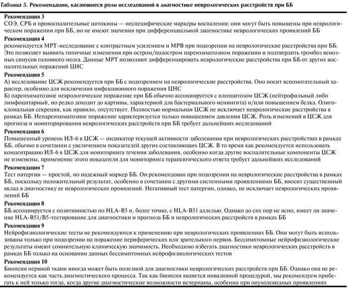 Таблица 5. Рекомендации, касающиеся роли исследований в диагностике неврологических расстройств при ББ