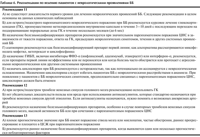Таблица 6. Рекомендации по ведению пациентов с неврологическими проявлениями ББ