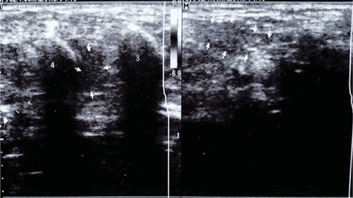 УЗИ позволяет визуализировать воспалительный процесс в синовиальных сумках с жидкостным содержимым (бурсит), может выявляться связь анэхогенного образования с полостью сустава, имеет четкие ровные гиперэхогенные контуры, иногда с гиперэхогенными включениями. Клинически, как правило, определялась невыраженная припухлость в проекции сумки.
