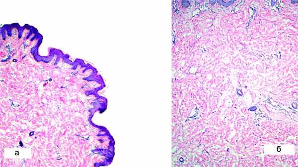 Пациенту выполнено гистологическое исследование кожи, по результатам которого обнаружена дезорганизация коллагеновых волокон (рис. 2). Рисунок 2. Патоморфологическое исследование кожи (окрашивание гематоксилином и эозином). а — ×100, б —×400: дезорганизация коллагеновых волокон, отсутствие воспалительного инфильтрата. Диагноз: эруптивная коллагенома. Учитывая множественные поражения, лечение не назначалось.