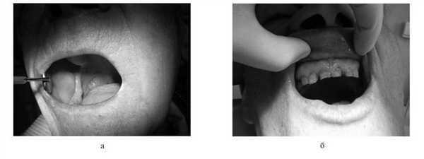 Безусловно, наиболее тяжелой для пациента (и для коррекции) является ксеростомия III степени. При нарушении функции слюнных желез III степени (функция слюнных желез полностью угнетена) больных беспокоят резкая сухость во рту, болезненные ощущения в слюнных железах, боль при еде, нарушение сна, речи. Отмечаются явления катарального глоссита, стоматита, слизистая оболочка ротовой полости сухая, гиперемирована, нередко с трещинами, эрозиями. Гипосаливация (сиалометрия — до 2 мл), повышенная вязкость, кислотность, пенистость слюны. Губы сухие, шелушатся, покрыты корками. Ксеростомия часто сопровождается множественным кариесом зубов (рис. 2, а). Рисунок 2. Осложнения химиолучевой терапии. а — ксеростомия III степени, б — лучевой кариес.
