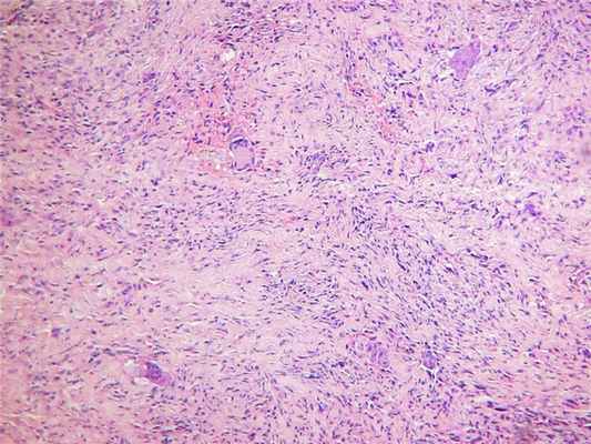 Возможен истинный рецидив, обычно спустя несколько лет после операции. Метастазы не наблюдаются. Макроскопически образование представляет собой плотный узел диаметром до 2-5 см, иногда дольчатый, на разрезе серовато-белого, желтоватого, иногда охряно-желтого цвета; изредка состоит из нескольких слившихся в конгломерат узелков. Микроскопическая картина крайне полиморфна: узел построен из мелких веретенообразных клеток с темным вытянутым ядром и узким ободком цитоплазмы, которые напоминакл фиброциты, и из более крупных овальных клеток со светлым округлым ядром и широким ободком цитоплазмы. Среди этих клеток рассеяны в различном количестве многоядер ные гигантские клетки с гомогенной, часто вакуолизированной цитоплазмой. Веретенообразные клетки формируют тяжи, идущие в различных направлениях, заключенные в мощные пучки коллагеновых и аргирофильных волокон. Округлые клетки располагаются мелкими рыхлыми скоплениями, в которых волокнистая субстанция не определяется. Эти клетки рассматриваются некоторыми авторами как «гистиоцитоподобные». Постоянной структурной особенностью является наличие многочисленных щелевидных пространств, выстланных светлыми клетками вытянутой формы.