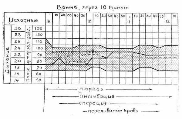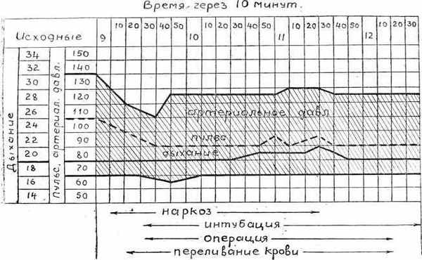 Рис 2. График течения операции больной Л., 42 лет. Диагноз: рак прямой кишки. Операция: брюшнопромежностная ампутация прямой кишки