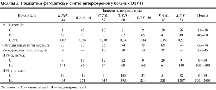 Таблица 3. Показатели фагоцитоза и синтез интерферонов у больных ОВИН Примечание. С — спонтанный; И — индуцированный.