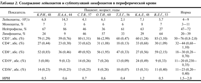 Таблица 2. Содержание лейкоцитов и субпопуляций лимфоцитов в периферической крови