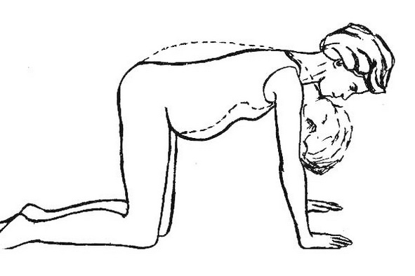 - «Кошечка». Женщине нужно встать в позу «кошечки» (на четвереньки и опереться на колени и ладони рук), глубоко вдохнуть, наклонить вниз голову, вверх - выгнуть свою спину. Дыхание не задерживать. Потом занять исходное положение.