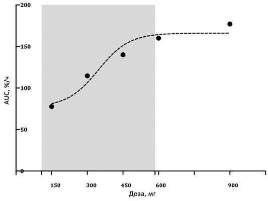 Выбор оптимального режима дозирования диосмина у человека был осуществлен на основании данных изучения резистентности венозной стенки у здоровых добровольцев после однократного применения препарата. При сопоставлении нарастающих доз от 150 до 900 мг была получена типичная S-образная кривая фармакодинамического ответа (рис. 3). Рис. 3. Влияние диосмина на прирост венозного сопротивления. Модель доза—ответ построена с помощью пакета GraphPad Prism 8.0. При использовании препарата в дозировках от 150 до 600 мг отмечалось возрастание сопротивления венозной стенки внешней компрессии, при этом характеристика нарастания зависимости доза—эффект была ближе к линейной. При использовании доз выше 600 мг линейная зависимость исчезала, кривая переходила в асимптотическую фазу, когда дальнейшее наращивание дозы не приводило к адекватному приросту эффекта [22].