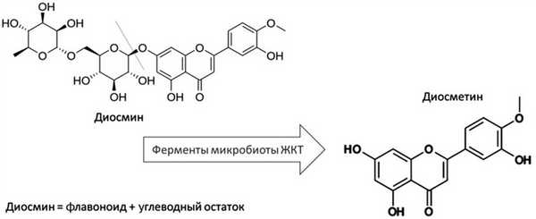 По своей химической природе диосмин представляет собой соединение полициклической флавоновой структуры с дисахаридом — 7-О-рамнозил-глюкозид диосметина. Свойства этого соединения таковы, что оно достаточно плохо проникает через фосфолипидный бислой клеточных мембран и его всасывания в кишечнике в неизмененном виде практически не происходит. Однако под влиянием ферментов кишечной микробиоты α-рамнозидаз и β-глюкозидаз от диосметина (так называемого агликонового основания) отщепляются углеводные компоненты, которые в дальнейшем могут служить пищей для обитающих в кишечнике сапрофитных микроорганизмов. Диосметин, являясь молекулой примерно в 2 раза меньшего размера, а также обладая большей липофильностью, легче проходит через клеточные мембраны и попадает в системный кровоток. Всасывание диосметина отсрочено в связи с необходимостью прохождения этапа бактериального метаболизма и начинается примерно через 1—1,5 ч после приема. Время достижения максимальной плазменной концентрации (Cmax) составляет 5 ч [8].