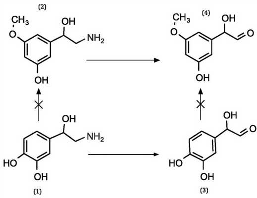 Особенности распределения препарата в организме и его тропность к тканям таковы, что наибольшее количество препарата после введения обнаруживается в препаратах вен. Поэтому повышение тонуса сосудистой стенки реализуется в первую очередь на этом уровне, не приводя к таким системным эффектам, как увеличение общего периферического сопротивления сосудов и повышение артериального давления. Предположительно механизм данного эффекта связан со способностью диосмина ингибировать фермент катехоламин-О-метилтрансферазу, ответственный за превращение норадреналина в норметадреналин (рис. 2). Рис. 2. Деградация норадреналина: норадреналин (1), норметадреналин (2), норадреналин альдегид (3), норметадреналин альдегид (4). Избирательное накопление норадреналина не только приводит к увеличению венозного тонуса и улучшению лимфатического оттока, но и уменьшает проницаемость капилляров (исторически первый выявленный эффект биофлавоноидов — витамина P). Клинически эти эффекты препарата могут приводить к уменьшению отеков конечностей [18].