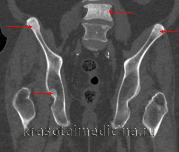 Из-за повышенной хрупкости костей у больного часто возникают переломы при минимальном воздействии. Чаще всего повреждаются крепкие кости бедра.