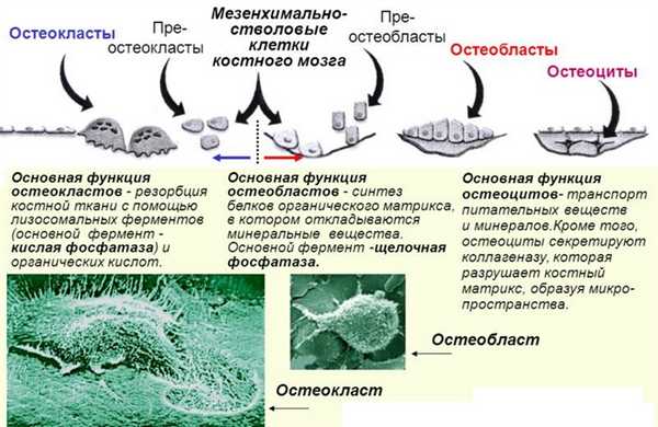 Основа нормального развития костной ткани – баланс образования остеобластов костной ткани и резорбции в остеокластах. Остеокласты по своей природе являются костными макрофагами, имеющими в структуре множество лизосом, при высвобождении содержания которых выделяются гидролитические ферменты, вызывающие резорбцию самой кости или обызвествленного хряща. Роль остеобластов состоит в создании и минерализации новой костной ткани, а остеокластов – в разрушении старой.
