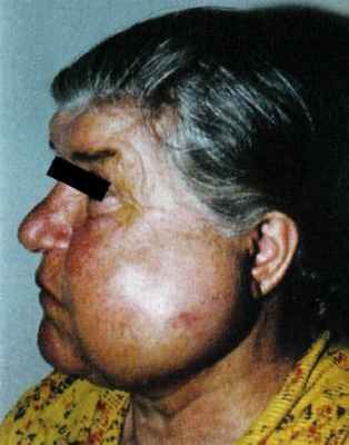 Клиника.Амелобластомы растут медленно, безболезненно. Первыми симптомами опухоли является прогрессирующая деформация лица, в последующем возникают боли в челюсти и зубах в области опухоли, зачастую интактных. Амелобластомы часто нагнаиваются, что способствует периодическому припуханию участка челюсти, развитию одонтогенных воспалительных заболеваний, формированию свищей с гнойным или геморрагическим отделяемым. При больших размерах опухоли формируются функциональные нарушения.